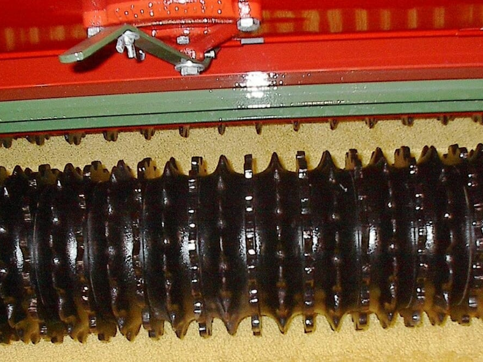The Brillion Sure Stand concept has survived the test of time and the challenges from many competitors and many different seeding methods.  However, the simplicity of the Sure Stand concept is still the best way to seed turf and grasses efficiently.  The larger front notched roller firms the seedbed and places shallow indentations into the soil surface.  The seed is metered from the seed boxes to free fall onto the deflectors; the deflectors then broadcast the seed across the full width of the seeder.  The smaller rear roller, with its notches splitting the middle of the front indentations, squeezes soil around the seed for the ultimate in seed to soil contact and consistent seed placement.