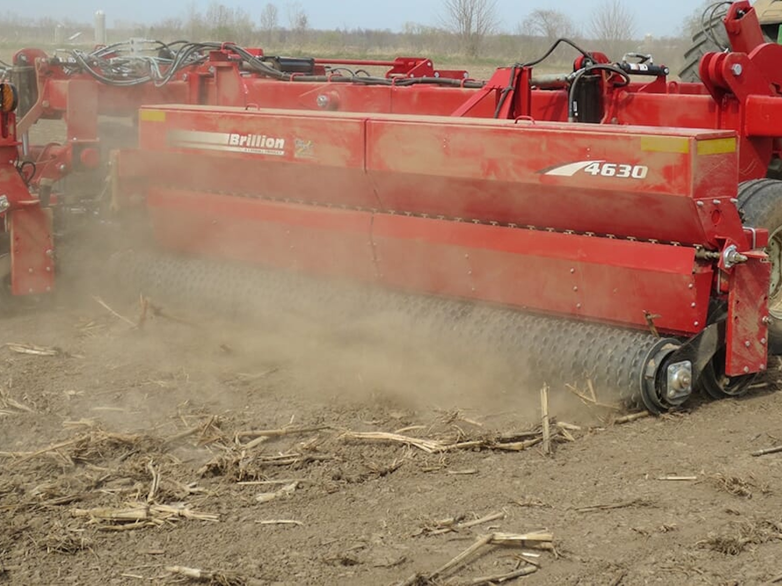 The Brillion Sure Stand concept has survived the test of time and the challenges from many competitors and many different seeding methods. However, the simplicity of the Sure Stand concept is still the best way to seed turf and grasses efficiently. The larger front notched roller firms the seedbed and places shallow indentations into the soil surface. The seed is metered from the seed boxes to free fall onto the deflectors; the deflectors then broadcast the seed across the full width of the seeder. The smaller rear roller, with its notches splitting the middle of the front indentations, squeezes soil around the seed for the ultimate in seed to soil contact and consistent seed placement.