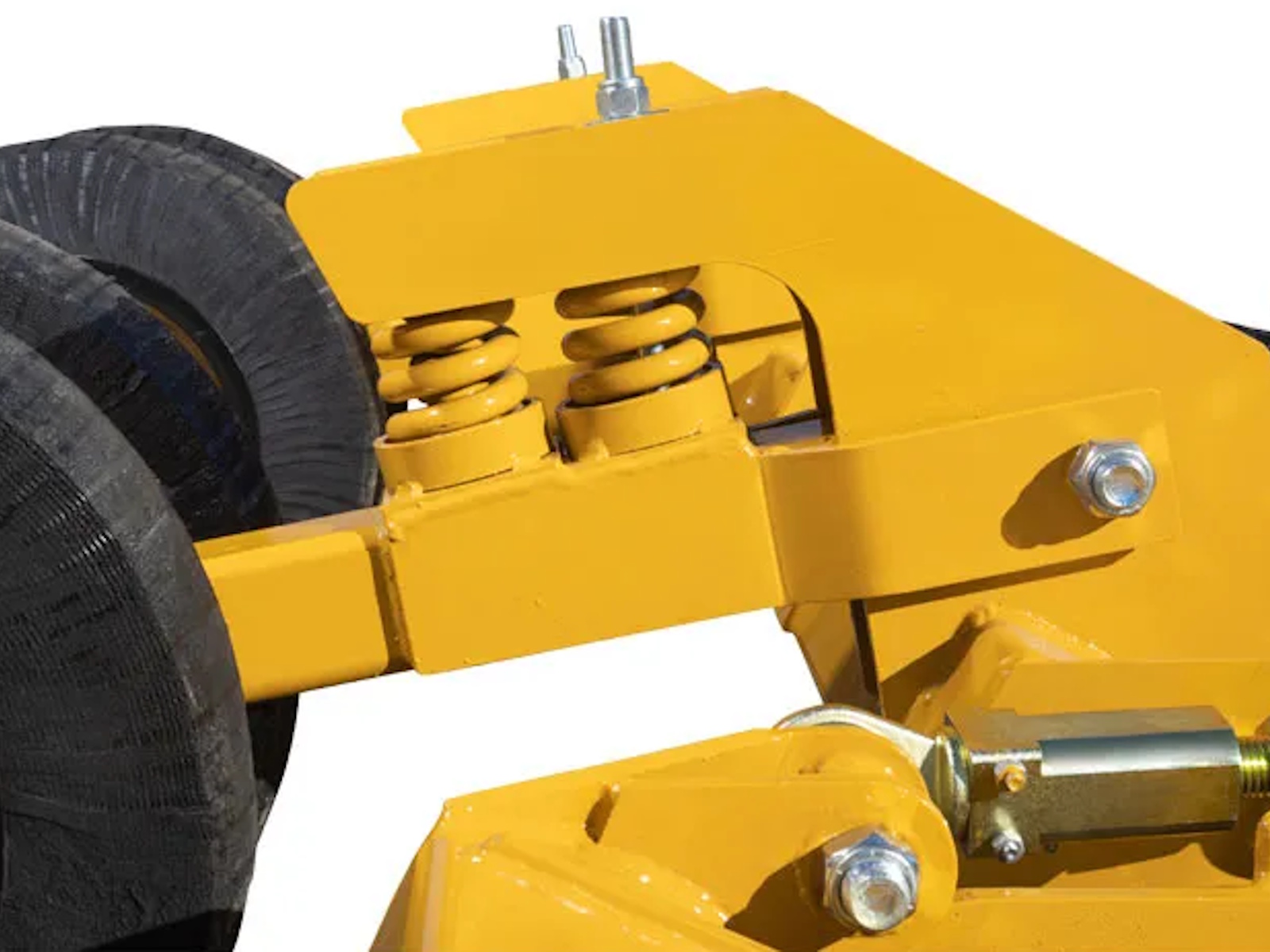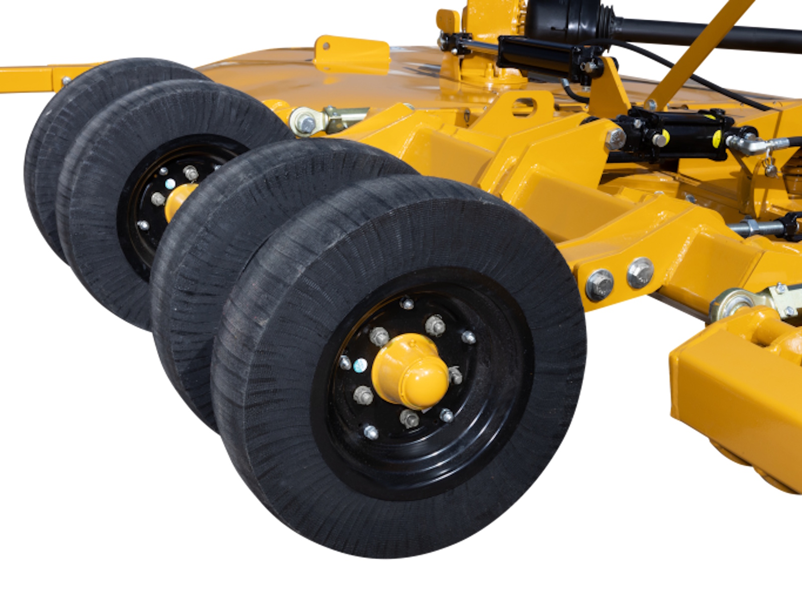 Five solid rubber tires standard. Independent shock absorbing system for all-wheel axles. Optional: 25” Treaded Laminate, Used Aircraft, or Used Foam-Filled Aircraft