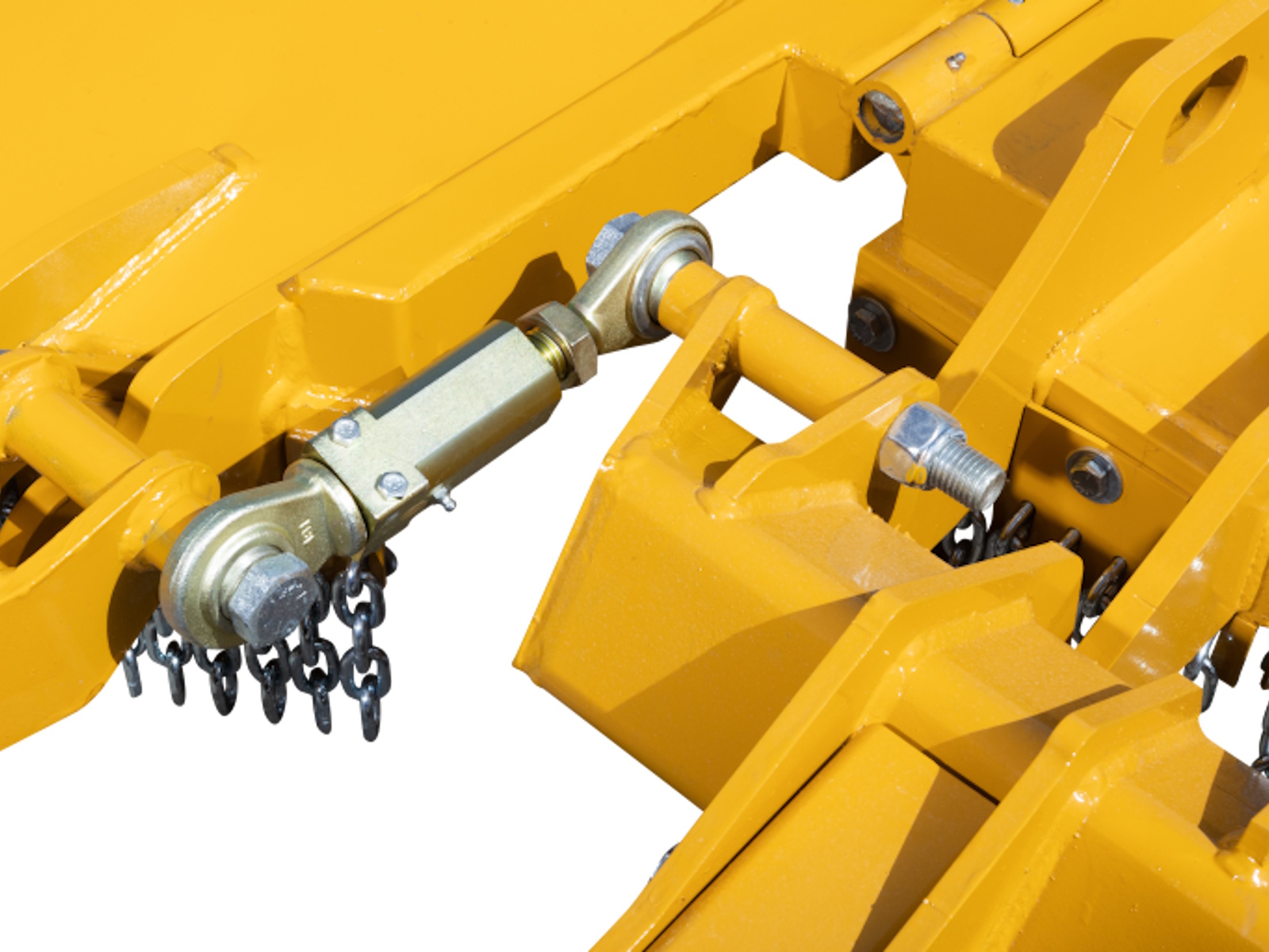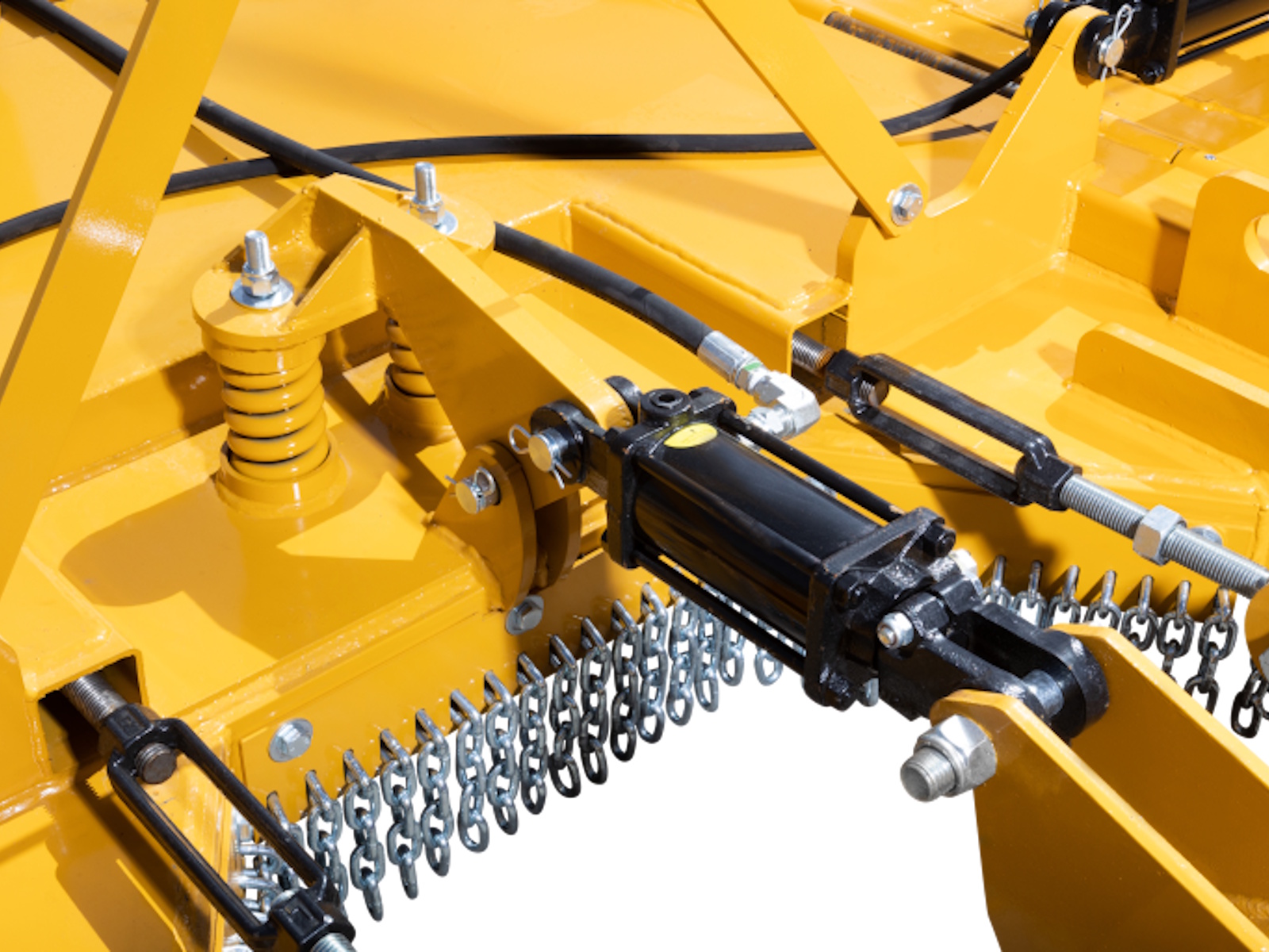 Replaceable center and full-length wing skid shoes, transport locking bars for each wing, heavy-duty tongue assembly with dual leveling rods, hydraulic hose holder, parking jack for easy hookup, and unhooking from a tractor. Chains: Standard; Double-Row Chain Guards are an option.