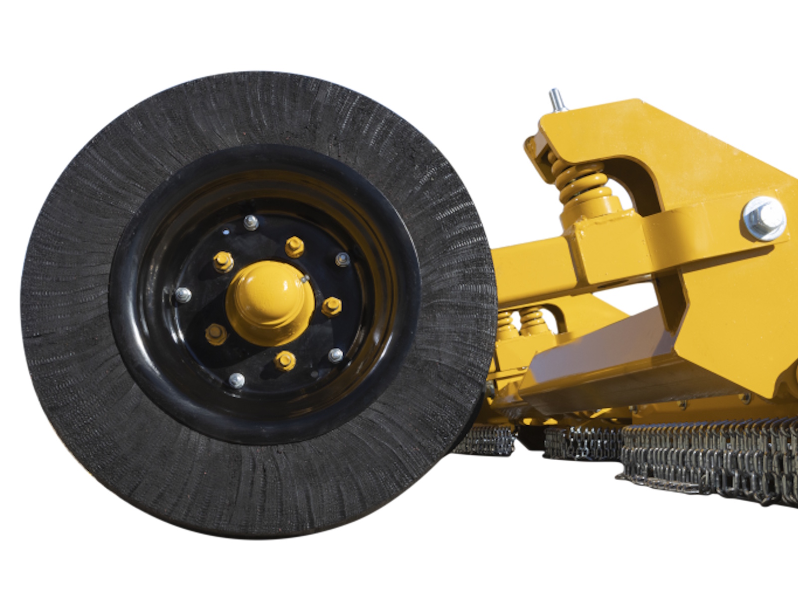 Six solid rubber tires standard. Independent shock absorbing system for all-wheel axles. Cutting height adjustable from 2″ to 15″. Optional: 25” Treaded Laminate, Used Aircraft, or Used Foam-Filled Aircraft