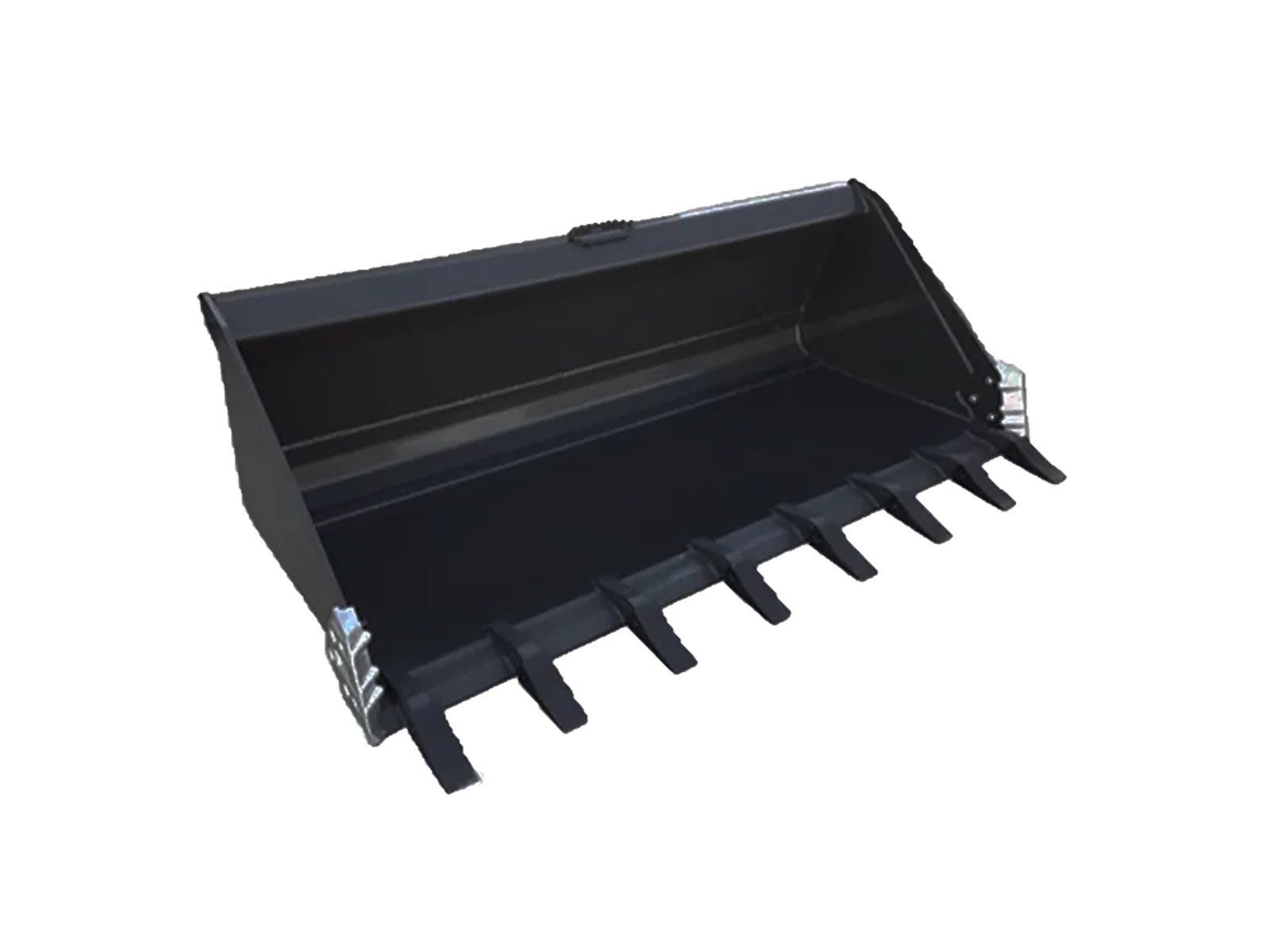 Designed for the most demanding track loaders on the market. 1” x 8” cutting edge, 1/2″ AR400 heel plate and 1/2″ wear bars, reinforced quick attach, ¼” bucket wrap, rolled back for easy clean out. 65 HP and over. (Image shown with Optional Teeth and Optional Side Cutting)