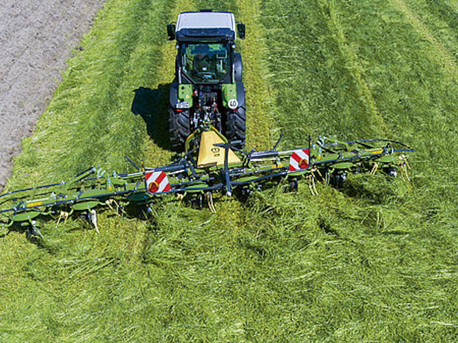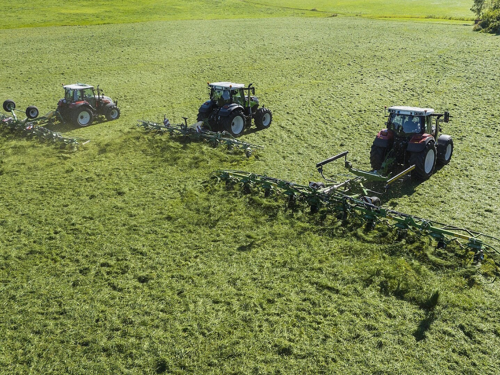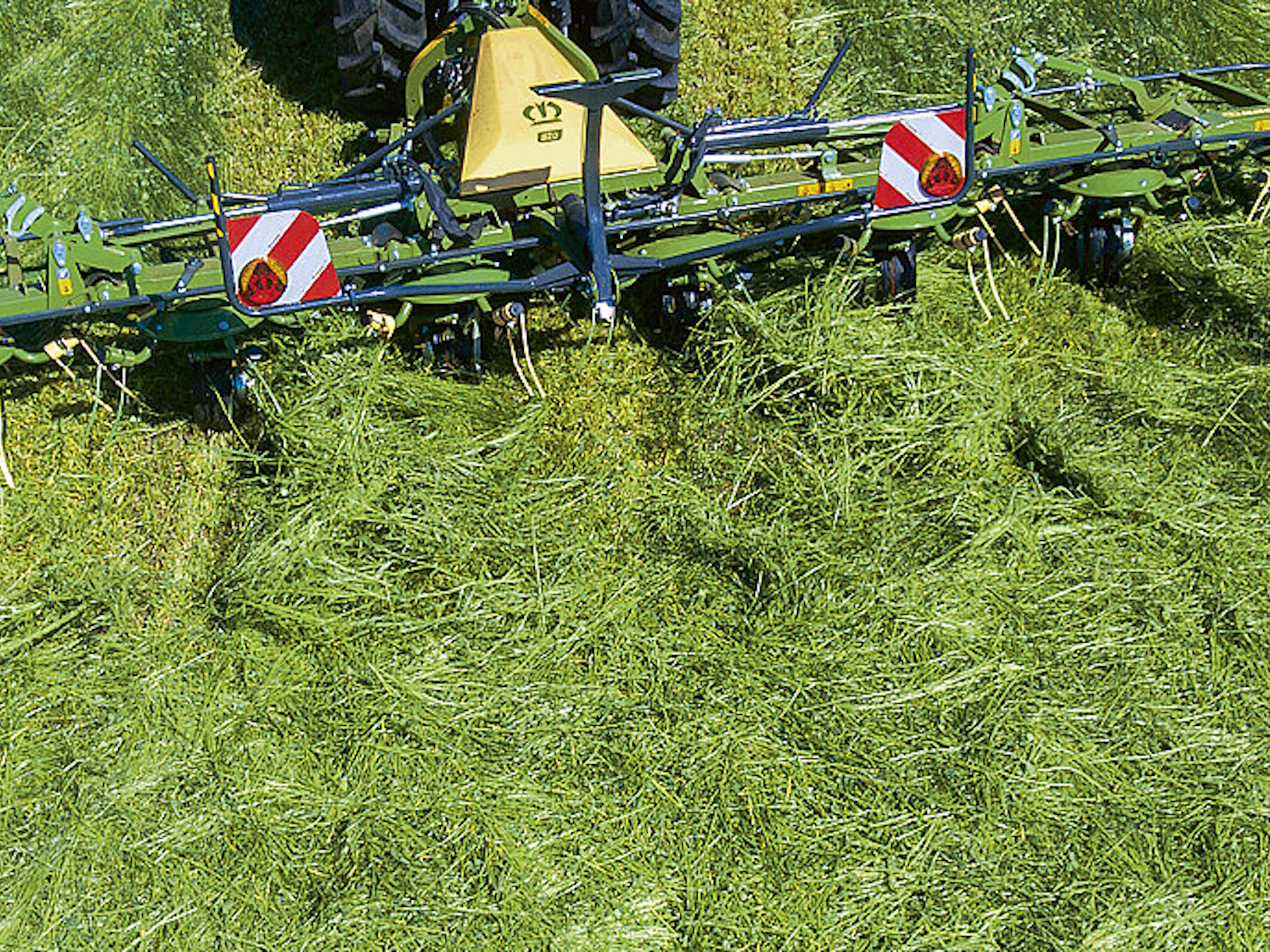 - Large choice of KRONE rotary tedders: 3-point mounted and trailed