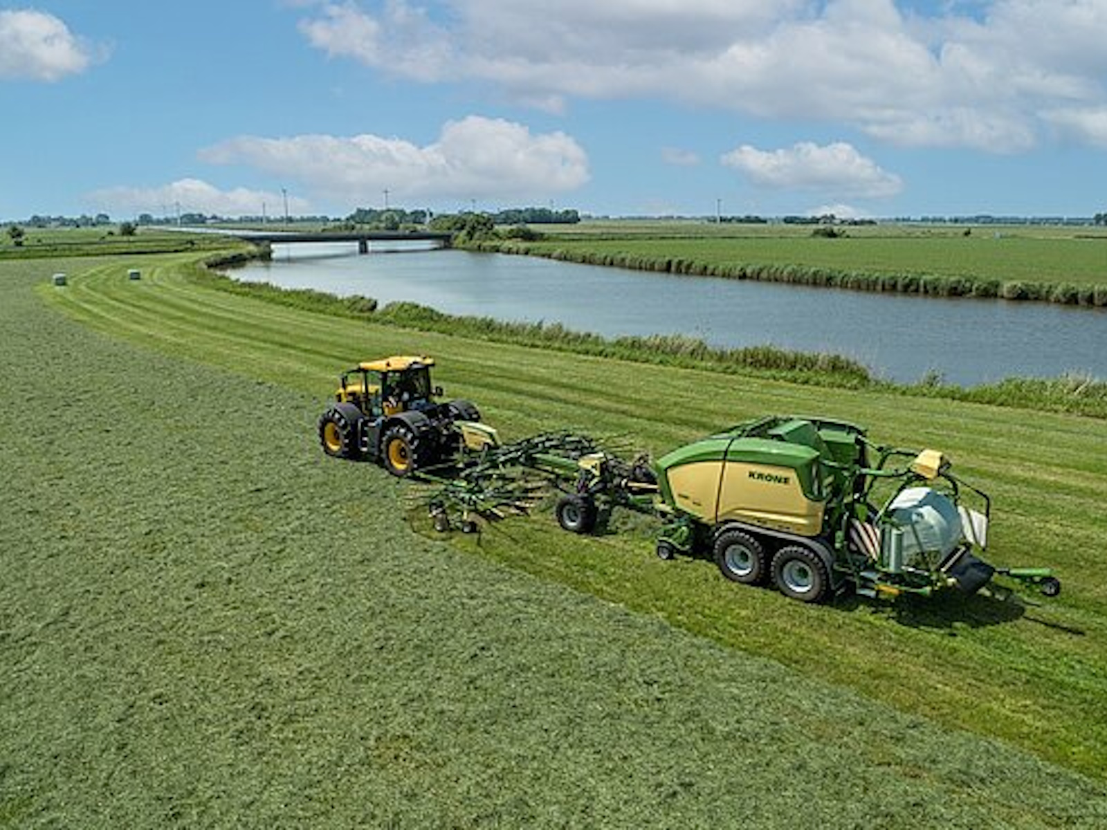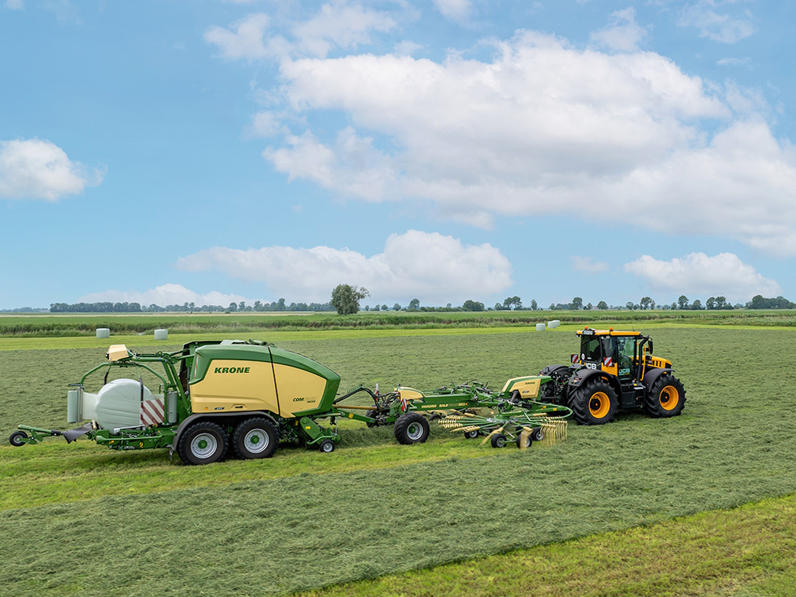 For the first time, a manufacturer is combining a rake and round baler for single person operation with maximum automation and efficiency. This combination is based on the modified Swadro TC 880 twin-rotor rake from KRONE, which merges with a KRONE round baler to form a highly efficient unit. The sole requirement placed on the baler is the ability for bottom hitching using a K 80 ball-head hitch and a PTO drive operating at 540 rpm.