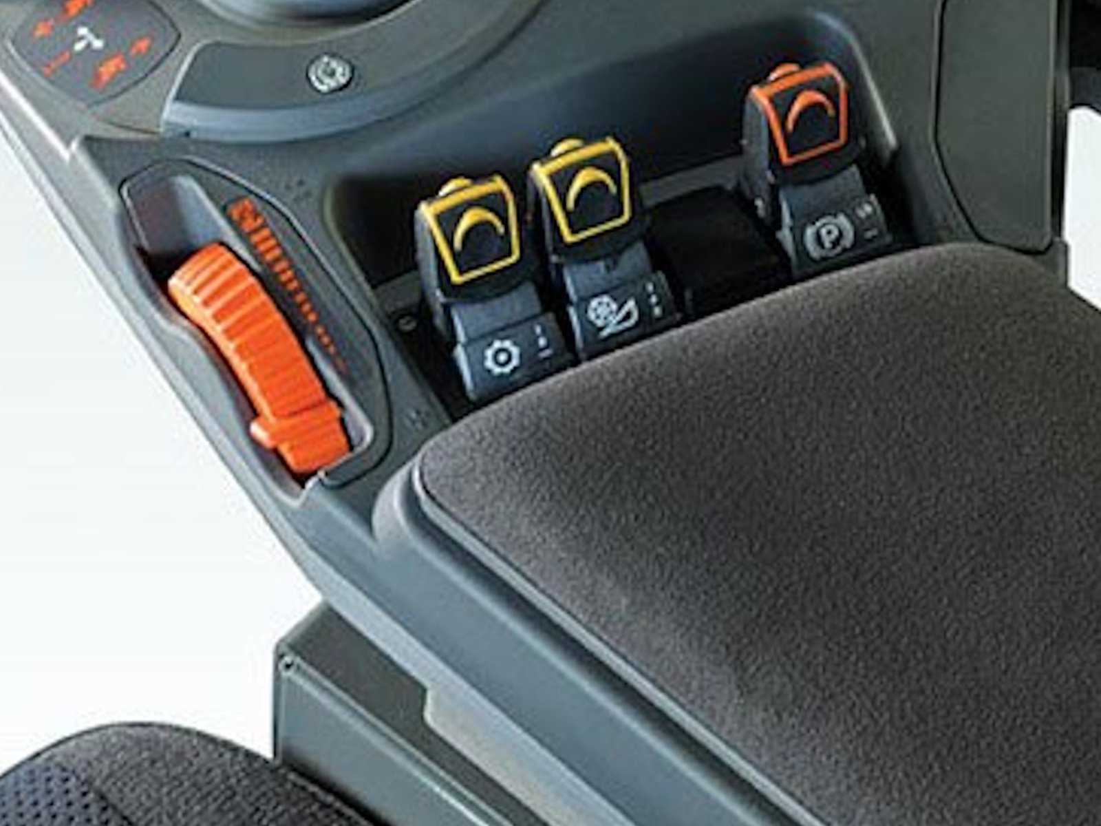 • The right-hand armrest is the central operating unit where the key engagement switches sit with the throttle control. Designed with a large soft pad to cushion the arm during a long day allows for maximum comfort.