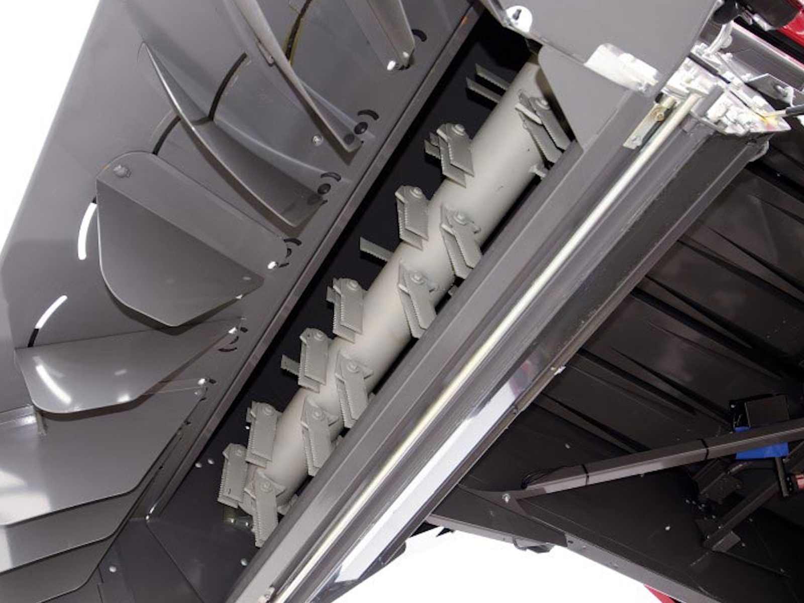 • The Power Feed Roller (MCS Version only) at the front of the main crop elevator gives a consistent crop flow from the table into the main crop elevator. It can be reversed simply and effectively from the cab.