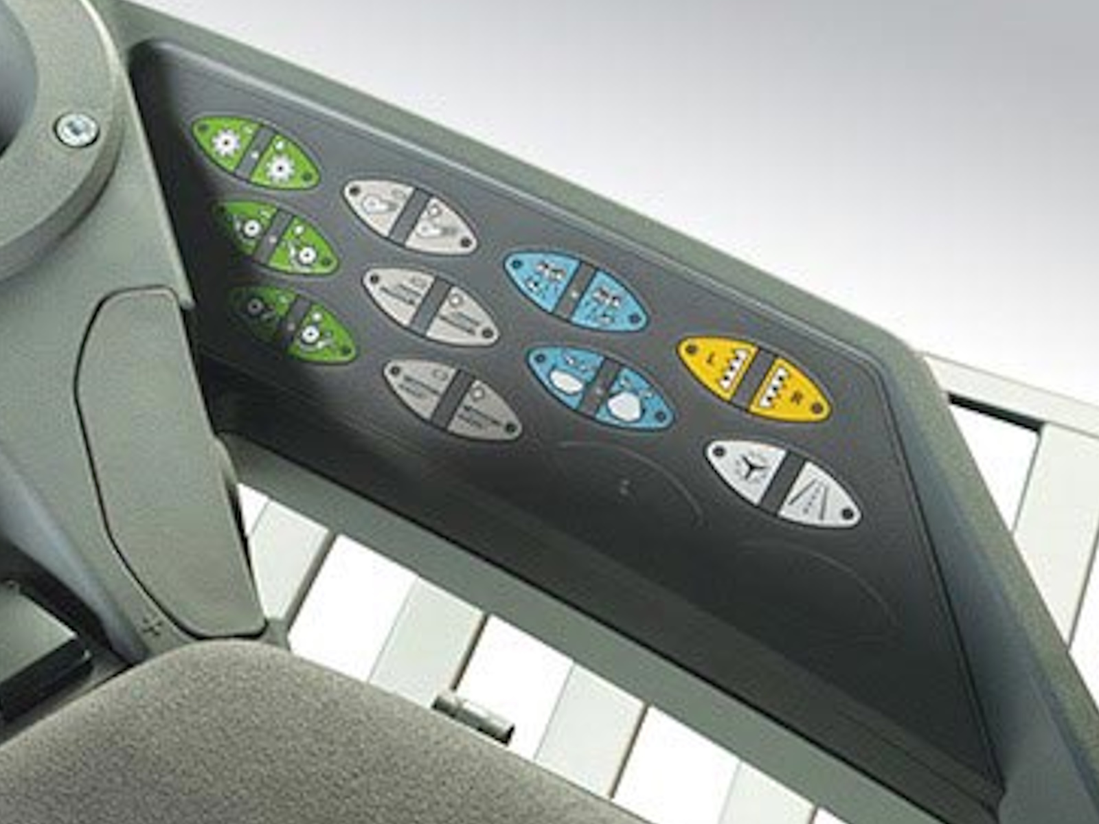 • The membrane keypad is located directly on the right side of the armrest and is used to operate the principle combine functions. The soft, raised keys lead directly to the individual menus on the TechTouch 2 terminal.
