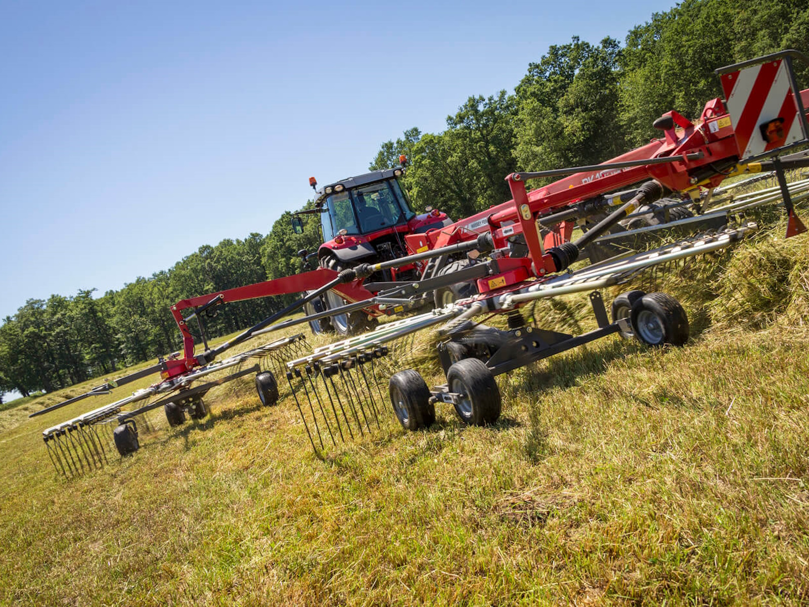 • MF side delivery rakes provide the perfect flexible solution in all terrains. With these rakes it is possible to deposit two narrow swaths, one large swath or a double swath by making a return pass.