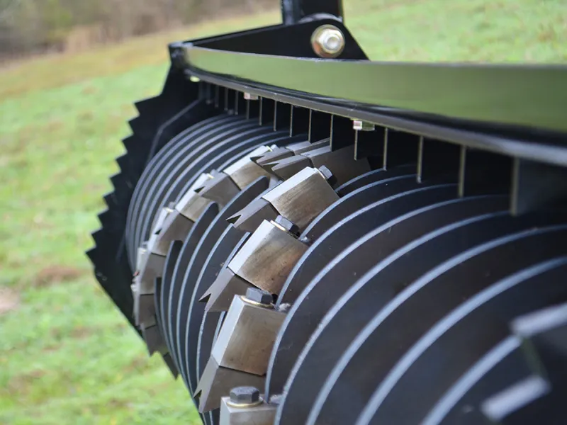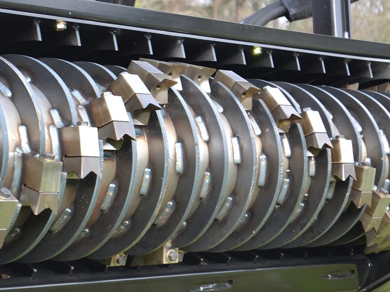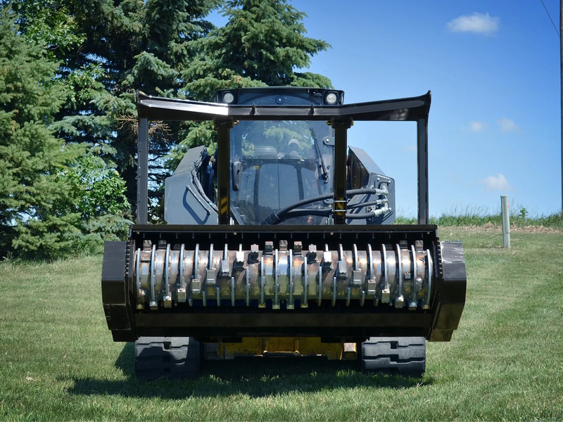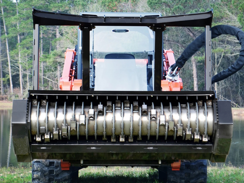 Drum mulchers get their name from the cylindrical, drum-like shape. These heavy-duty land clearing mulchers attach to skid loaders and shred small trees and brush with a forward spinning motion — a quality that makes them great options for quick brush and undergrowth removal.