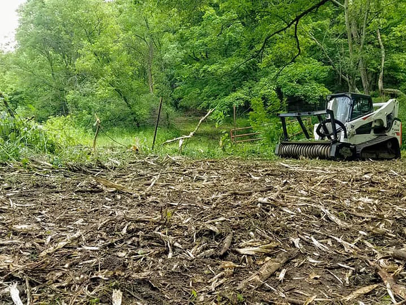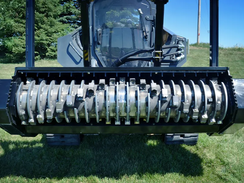 Drum mulchers get their name from the cylindrical, drum-like shape. These heavy-duty land clearing mulchers attach to skid loaders and shred small trees and brush with a forward spinning motion — a quality that makes them great options for quick brush and undergrowth removal.