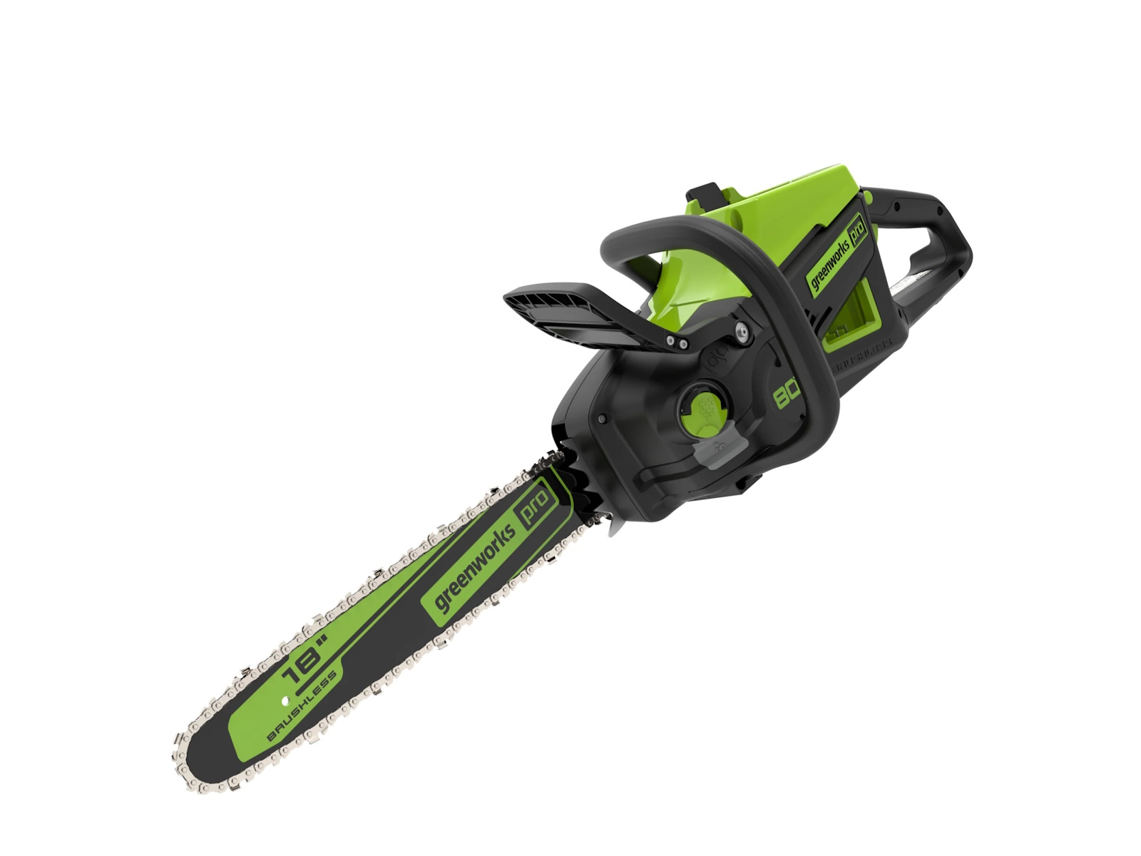 Our Greenworks 18" Chainsaw features a high-efficiency 80V brushless motor with electric start which provides more power, torque, and longer life without the hassle of gas. Equipped with 18" bar and chain for dependable performance. Automatic oiler easily applies oil to the chain keeping it lubricated. Mechanical chain brake halts the chain movement to prevent accidental kick back. This chainsaw is compatible with the Greenworks 80V system of 75+ tools and batteries and is backed by a 4-year warranty.