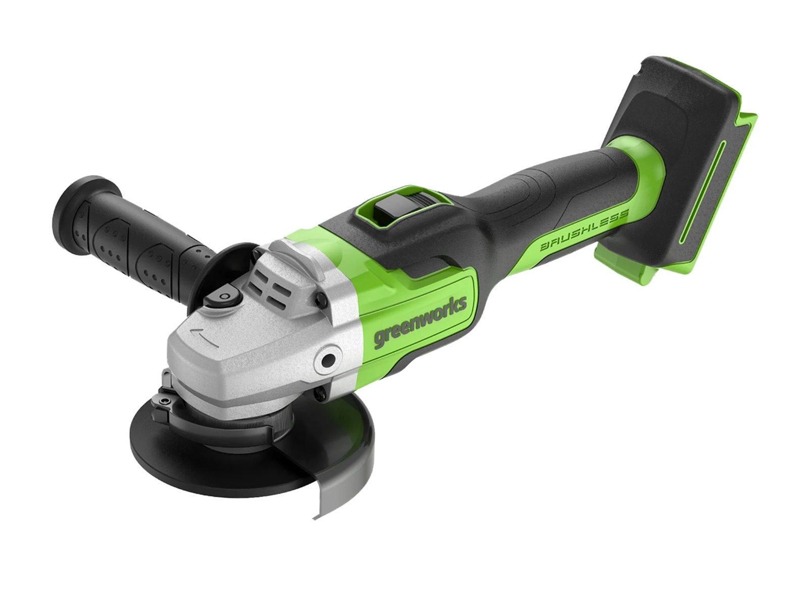 Get power and convenience with this Greenworks 24V Brushless 4-1/2" Angle Grinder. The high-performance brushless motor features 10,500 RPM and the aluminum gear box is durable and cools quickly. Greenworks 24V lithium-Ion battery provides 20% more power and 35% more run-time, and delivers fade-free power with no memory loss after charging.