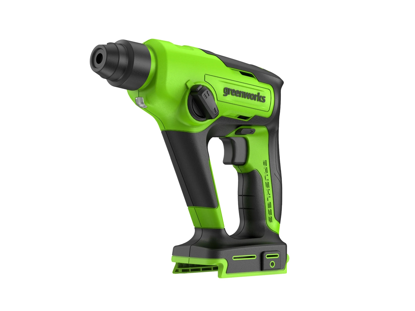 The Greenworks 24V 1.2J SDS Rotary Hammer is ideal for hammer drilling into concrete, bricks and masonry. The high-performance brushless motor features 0-1,440 RPM and 4,800 BPM to power through the toughest materials. Greenworks 24V lithium-Ion battery provides 20% more power and 35% more run-time, and delivers fade-free power with no memory loss after charging.