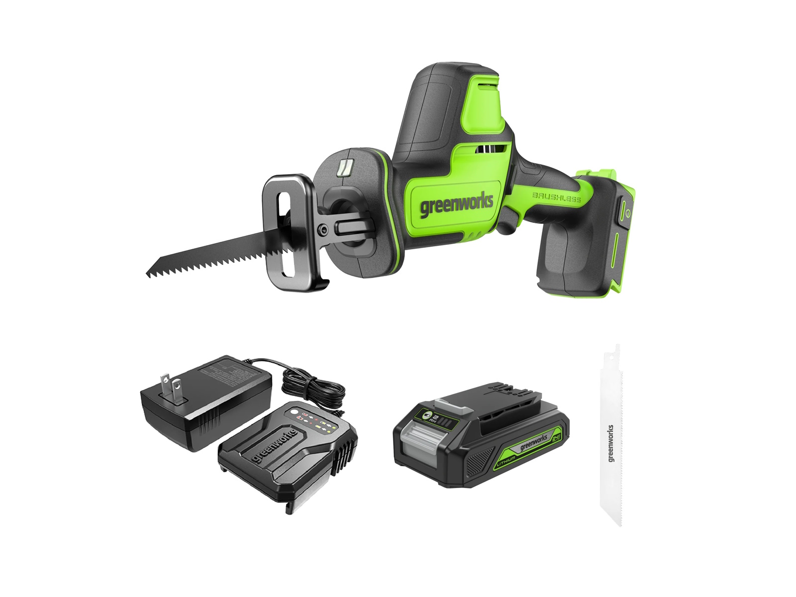2024 Green Works 24V One-Handed Compact Reciprocating Saw 1" w/ 2.0Ah Battery & Charger