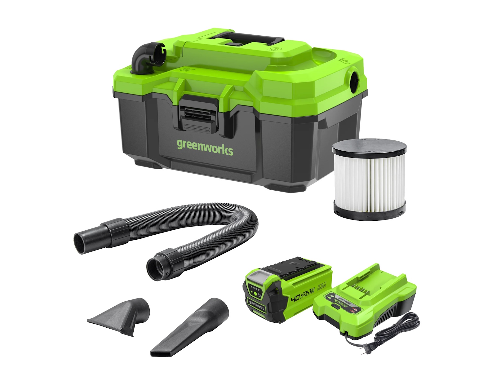 2024 Green Works 40V 3-Gallon Cordless Wet/Dry Shop Vacuum 2.0Ah Battery & Charger