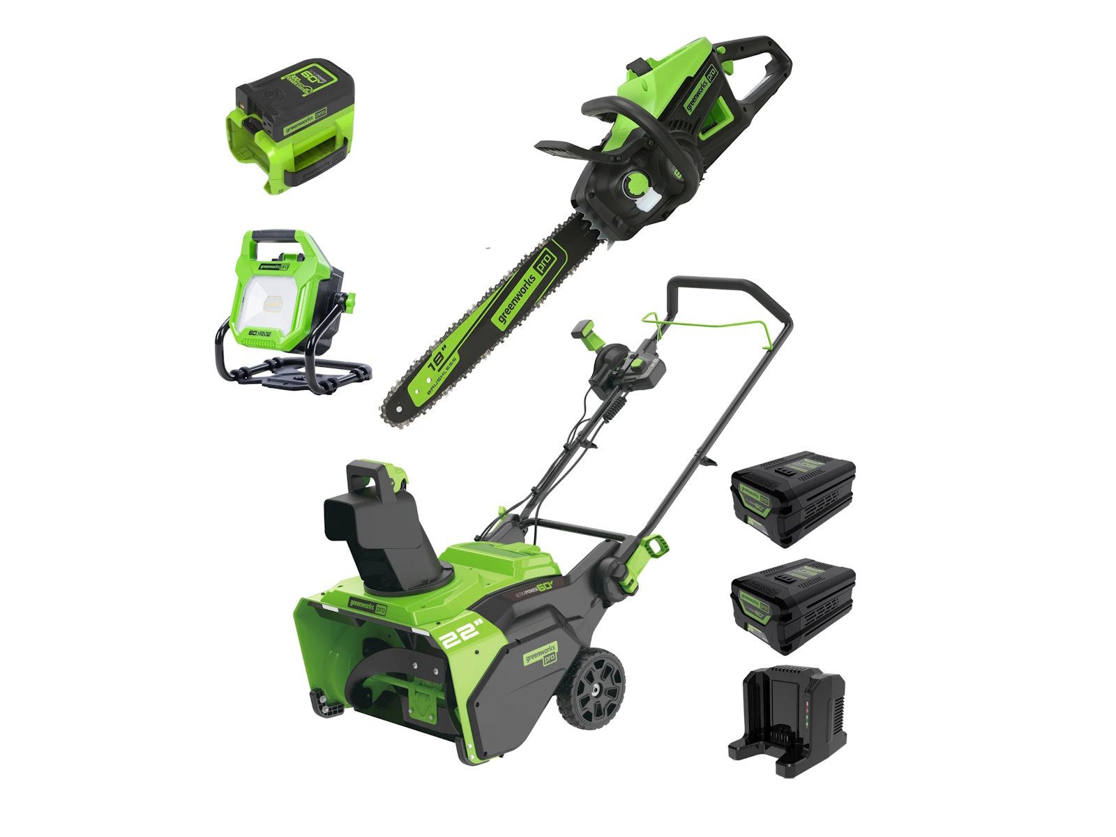 The powerful Greenworks Pro 60V UltraPower™ cordless battery platform gives you all the power you need to tackle all your lawn care projects. Kick gas to the curb this winter and go green with no fumes, no mixing, no maintenance and no pull cords. Let Greenworks help you take the work out of snow removal.Built with a high-efficiency brushless motor and a 22" wide intake, the Greenworks Pro 60V Cordless Snow Blower can handle it all. Easily adjust the auger to control how far the snow is thrown for maximum control. A robust handle-mounted chute-adjustment lever puts the user in control when re-directing the snow up to 180° from side to side. Bright LED lights make it convenient for use early in the morning or at night and the robust steel chassis is built for aggressive use in demanding conditions.