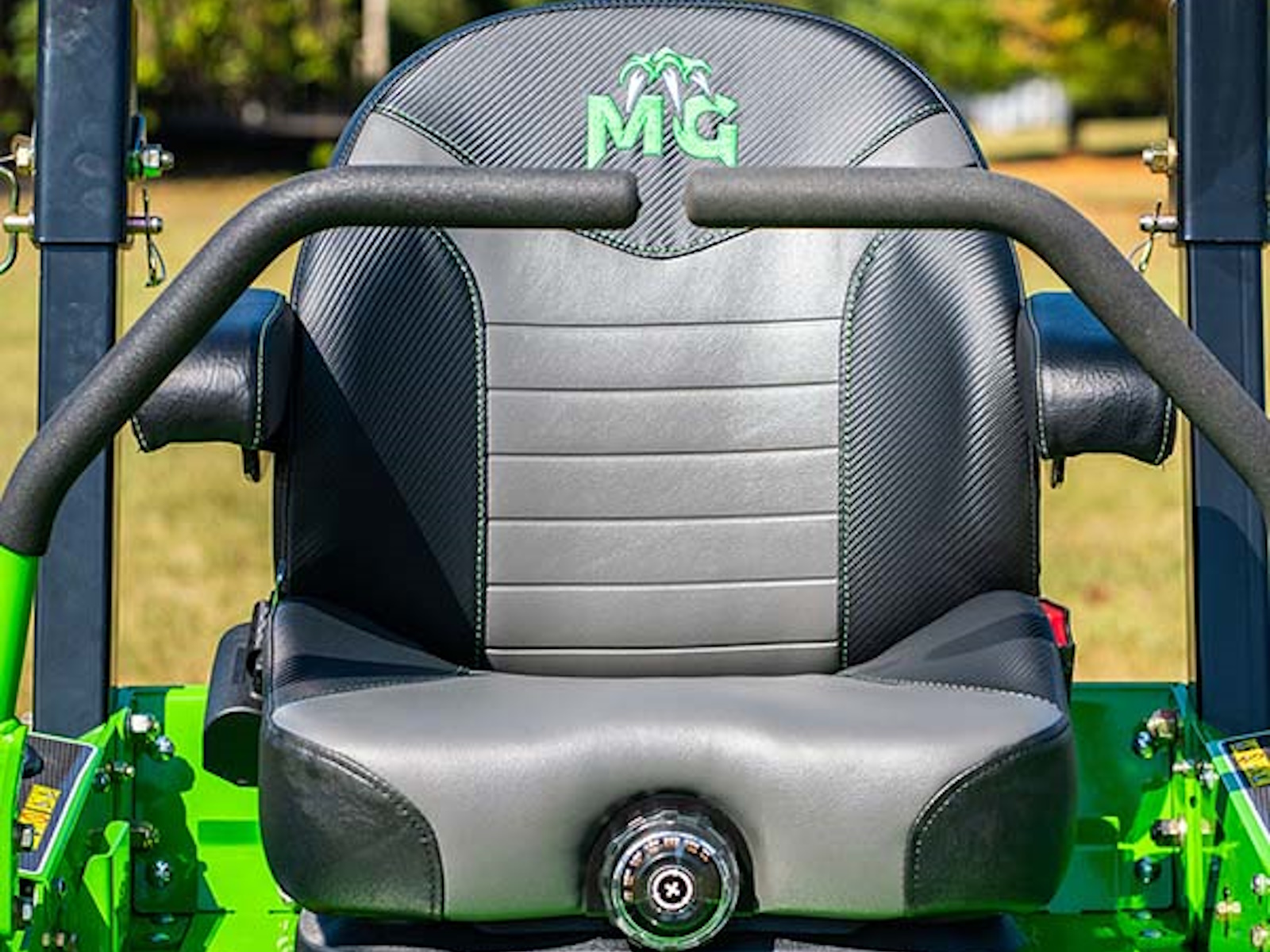 Custom, comfort high-back suspension seat with adjustable padded arm rests. Designed for maximum operator comfort!