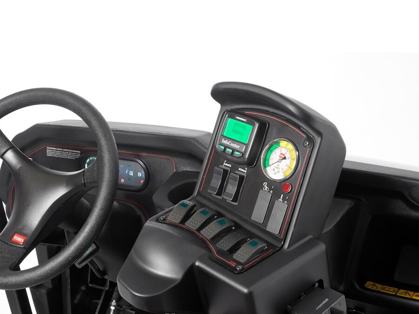 - Quick Find™ Console: The Quick Find™ Console helps the operator intuitively find boom and actuator switches with the palm of their hand and places command of all key vehicle and sprayer systems at the operator's fingertips for ease-of-use and improved control. The Info Center display and the analog pressure gauge, which are convieniently located just above the boom section and actuator switches, keeps all key sprayer operation data in the operator's line of sight.