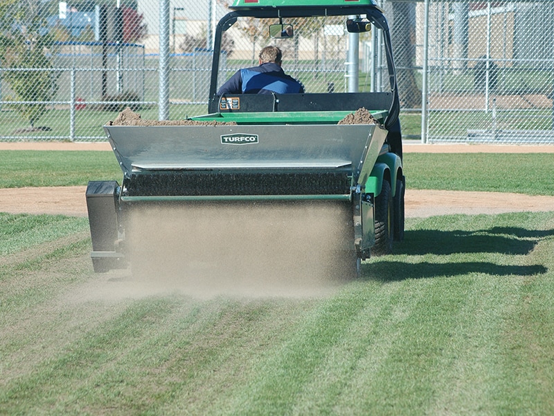 Ideal for golf greens, cultured grasses and other areas sensitive to weight, this topdresser utilizes an eco-friendly, patented ground-drive system. When you speed up, slow down or cross uneven terrain, the conveyor belt and brush automatically adjust at the same rate to provide a consistent and even application every time. No hydraulics, no pumps and no engines. Just hook up and go.