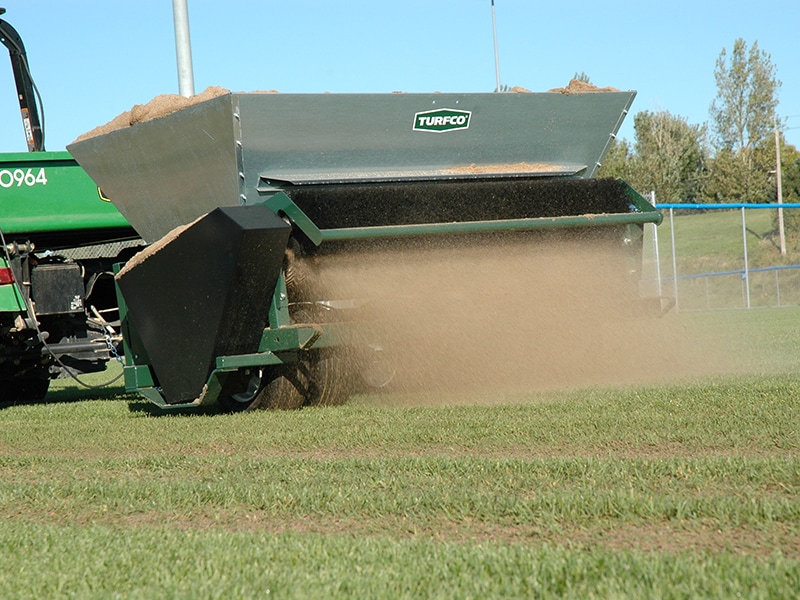 Turfco Mete-R-Matic topdressers, featuring a patented Chevron belt, are the first and only to ensure uniform application of all types of materials and varying levels of moisture content, including wet sand. You can consistently apply a wide variety of topdressing mixtures such as sand, organic and inorganic compost, peat and humus, rye grass, as well as crumb rubbers, gypsum, lime and calcine clays.