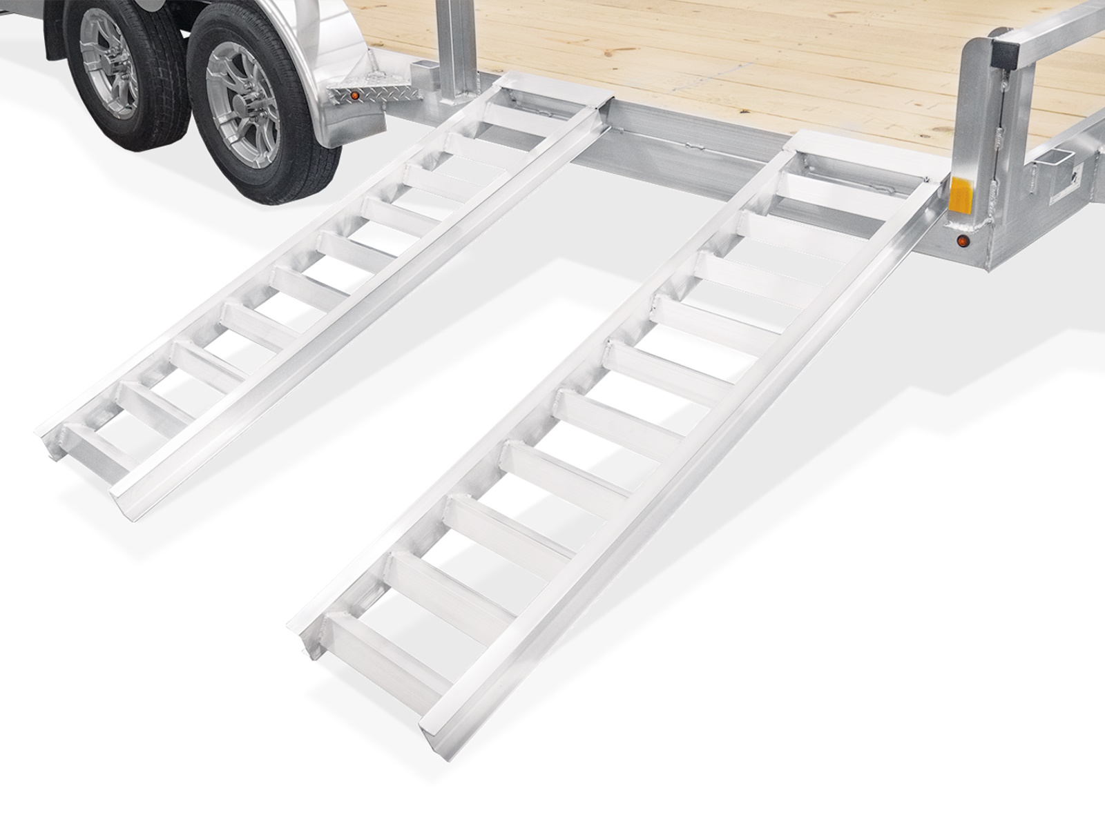 The lightweight, easy-to-handle rear ramp makes it simple to load everything from ATVs to lawn tractors. Plus, it reduce wind drag for an smoother haul. - Aluminum Wheels – Lightweight Performance with a Premium Look